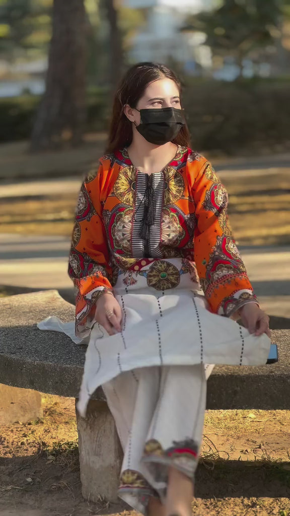 "Stay ahead of the trend with our Most Trending Article Orange Long Shirt Cordset. Made with premium Swiss Lawn fabric, this 2-piece set features a beautifully printed front and flapper, perfect for any occasion. With sizes ranging from Medium to Large, you can enjoy a comfortable and stylish fit. Chest sizes 20/21 for Medium and 22 for Large. Shirt length at 48 and flapper length at 38 for Medium, and 39 for Large."